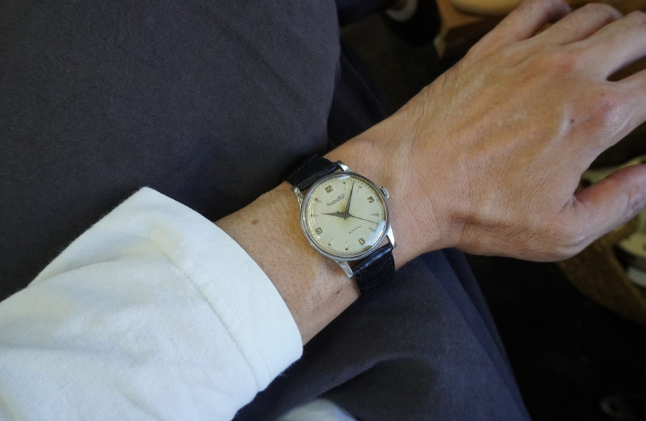 クラシックな筆記体ロゴで50年代の自動巻モデルになります。